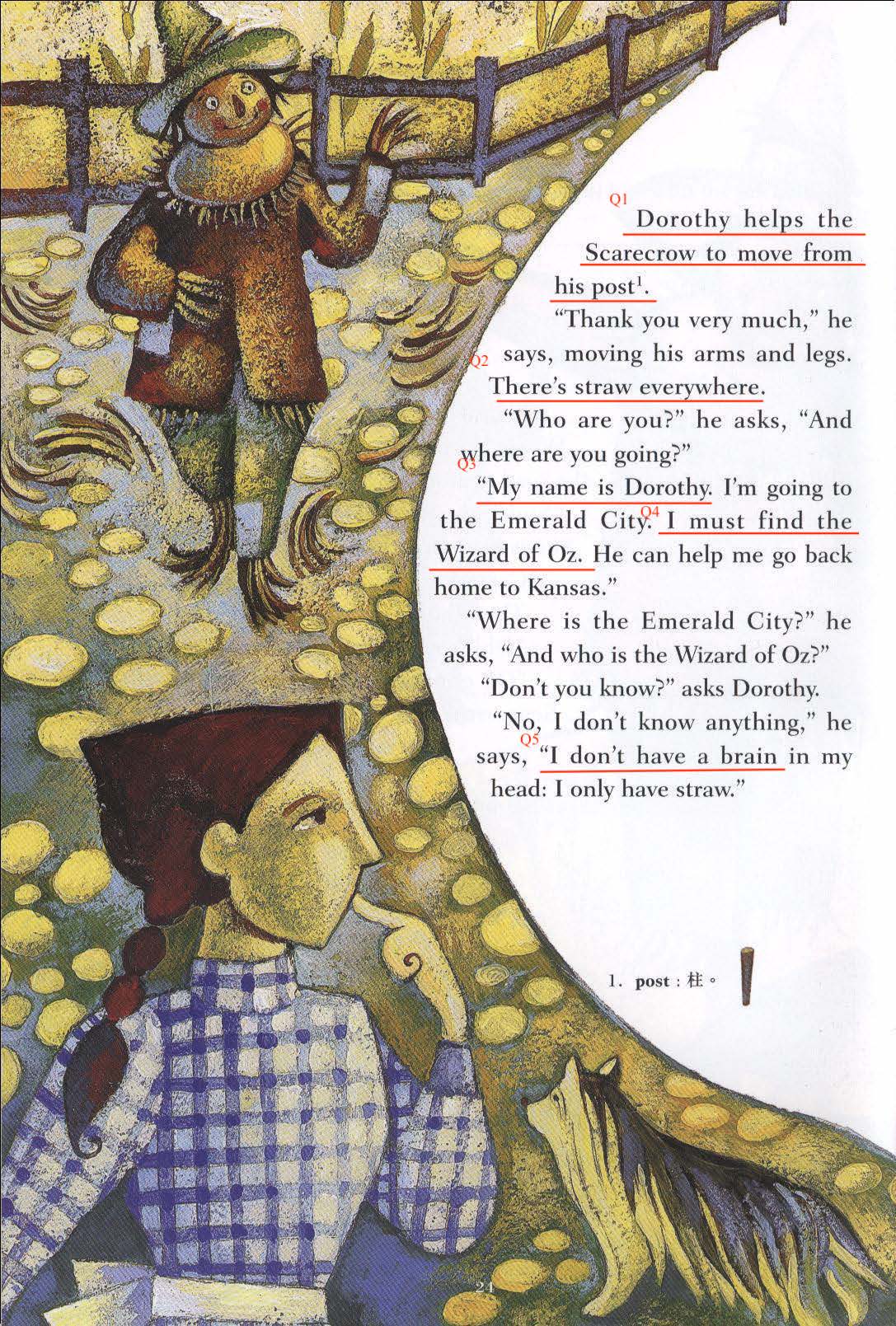Q1 Dorothy helps the Scarecrow to move from his post.