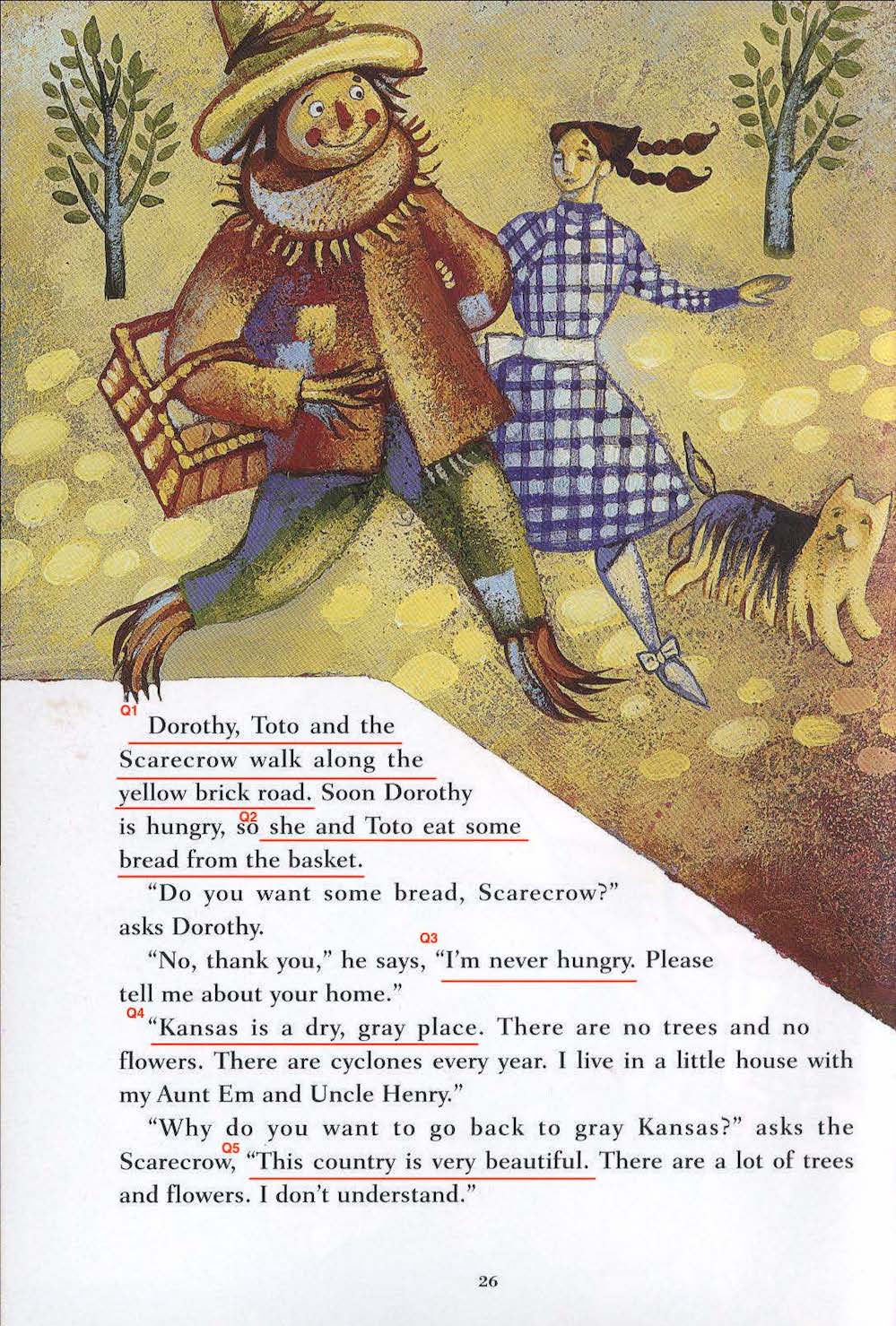 Q1 Dorothy, Toto and the Scarecrow walk along the yellow brick road.